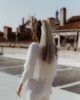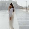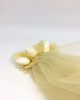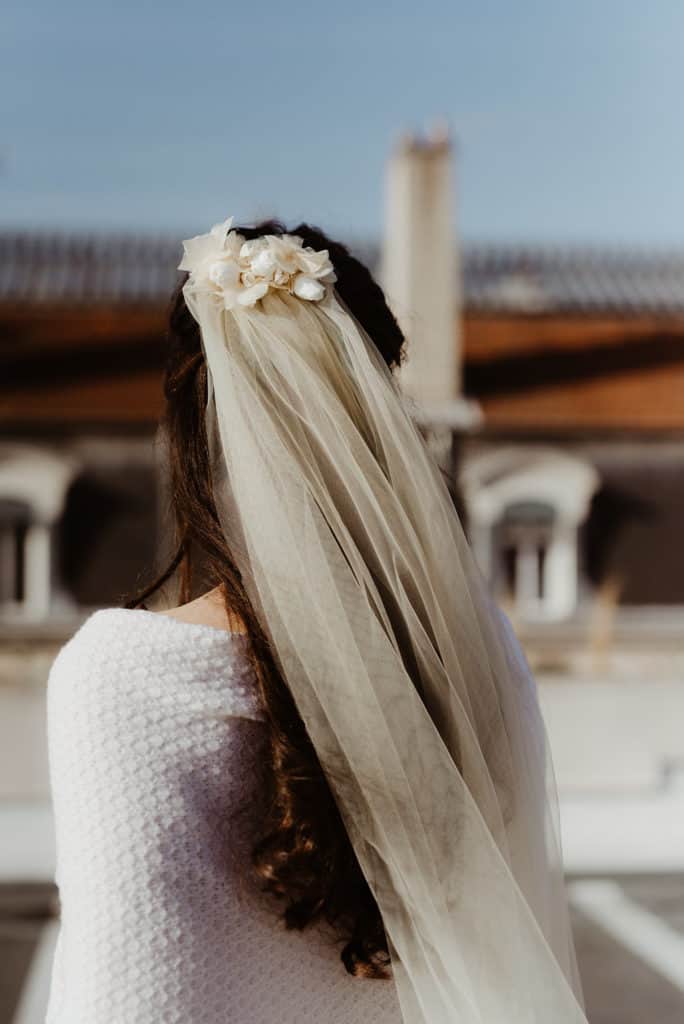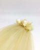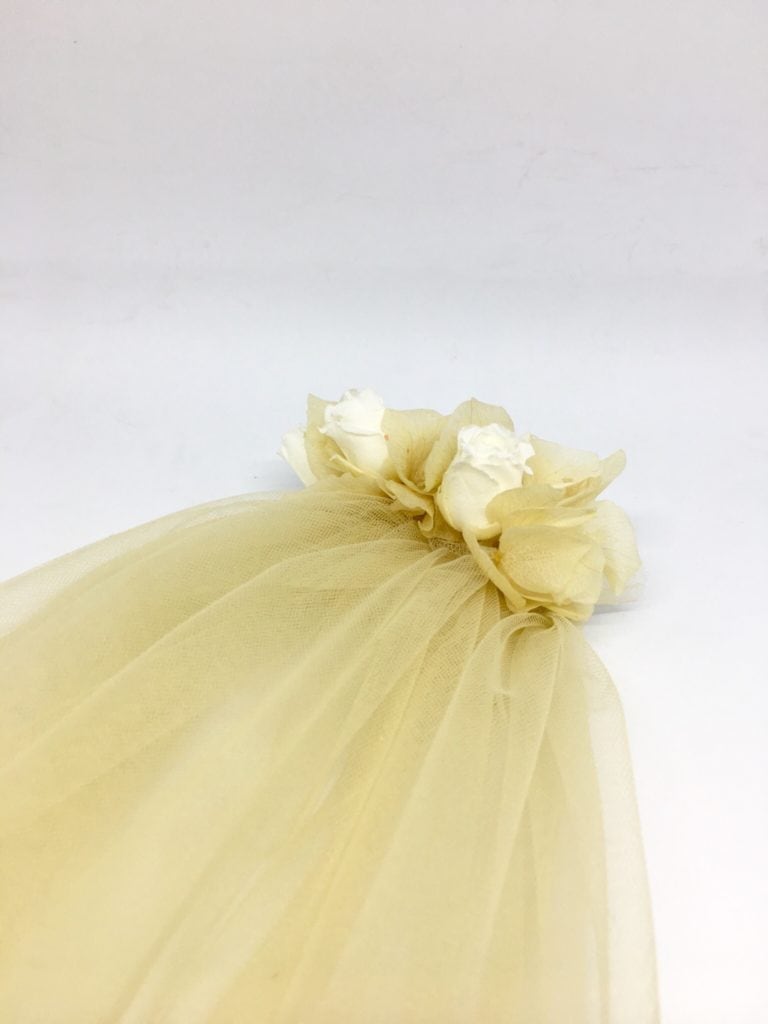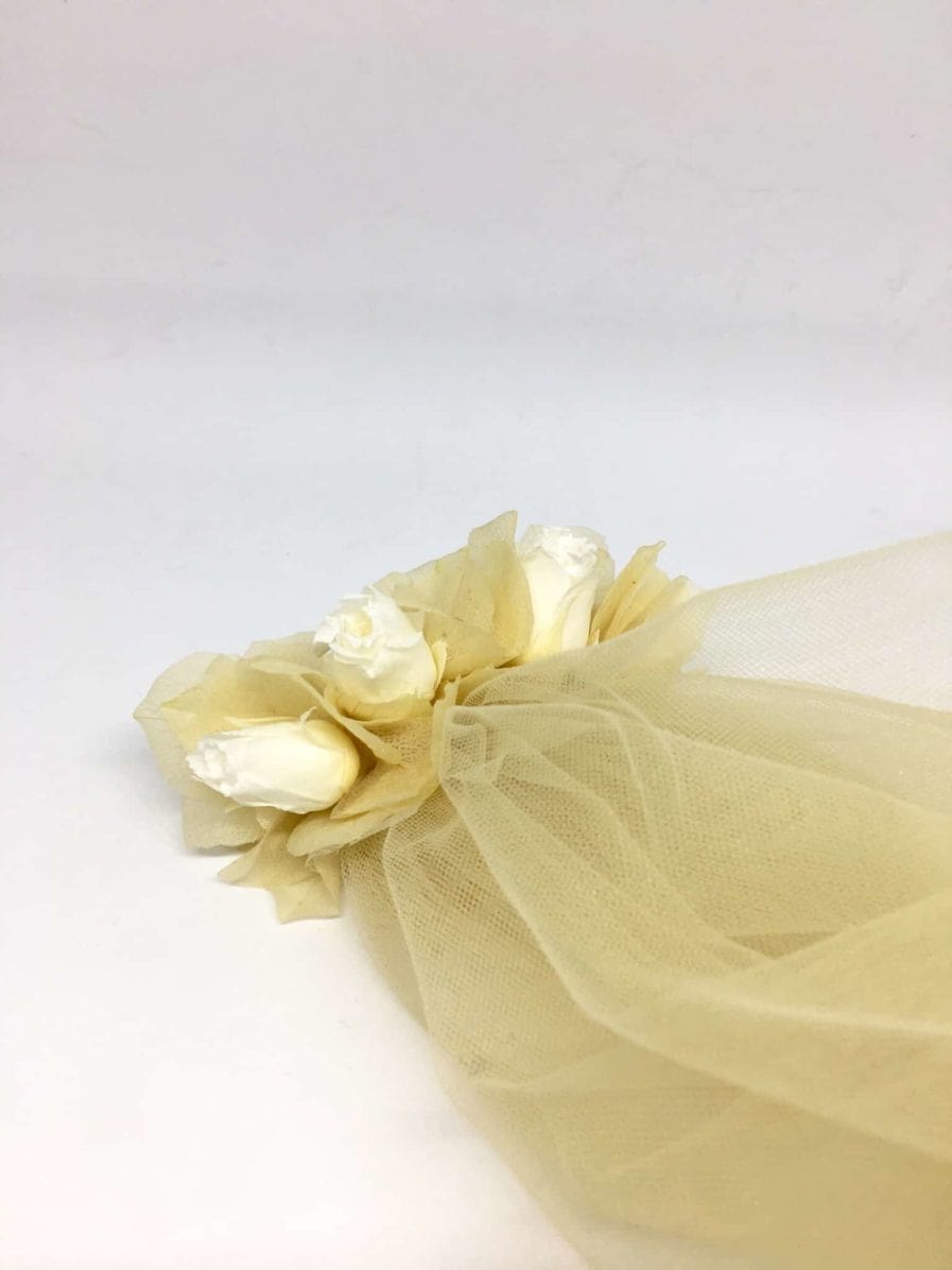 Créé à partir de tulle de couleur champagne, fixé à un peigne de fleurs stabilisées, constitué d’hortensias champagne et de boutons de roses blanches, le voile de mariée fleuri Ella est une ode à la légèreté, au romantisme et à la volupté.